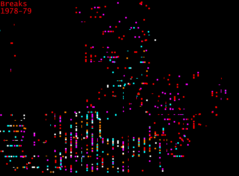 And 1978-79 were the worst years of all, as the break rate, helped along by some cold winters, skyrocketed from 800 to 1200 per year. It was around this time that we pulled out a few pipes that were less than 10 years old. If there had been any doubt that we had to get a grip on corrosion control, these years put an end to it.