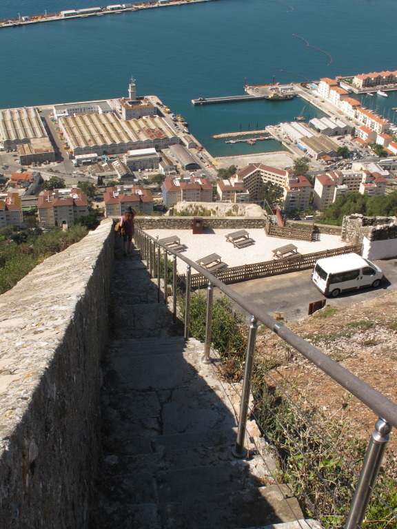 How do you climb the Rock of Gibraltar? Not like the Rockies. It's all paved. First, you find your way up the switchbacked road above the main square, through the levels of apartments, and finally (expensive, no doubt) private homes above them. You could go all the way up to the top walking the road, but you have to keep dodging the constant traffic of cars and little tour vans, barely narrower than the road. So we were looking for the stairs...