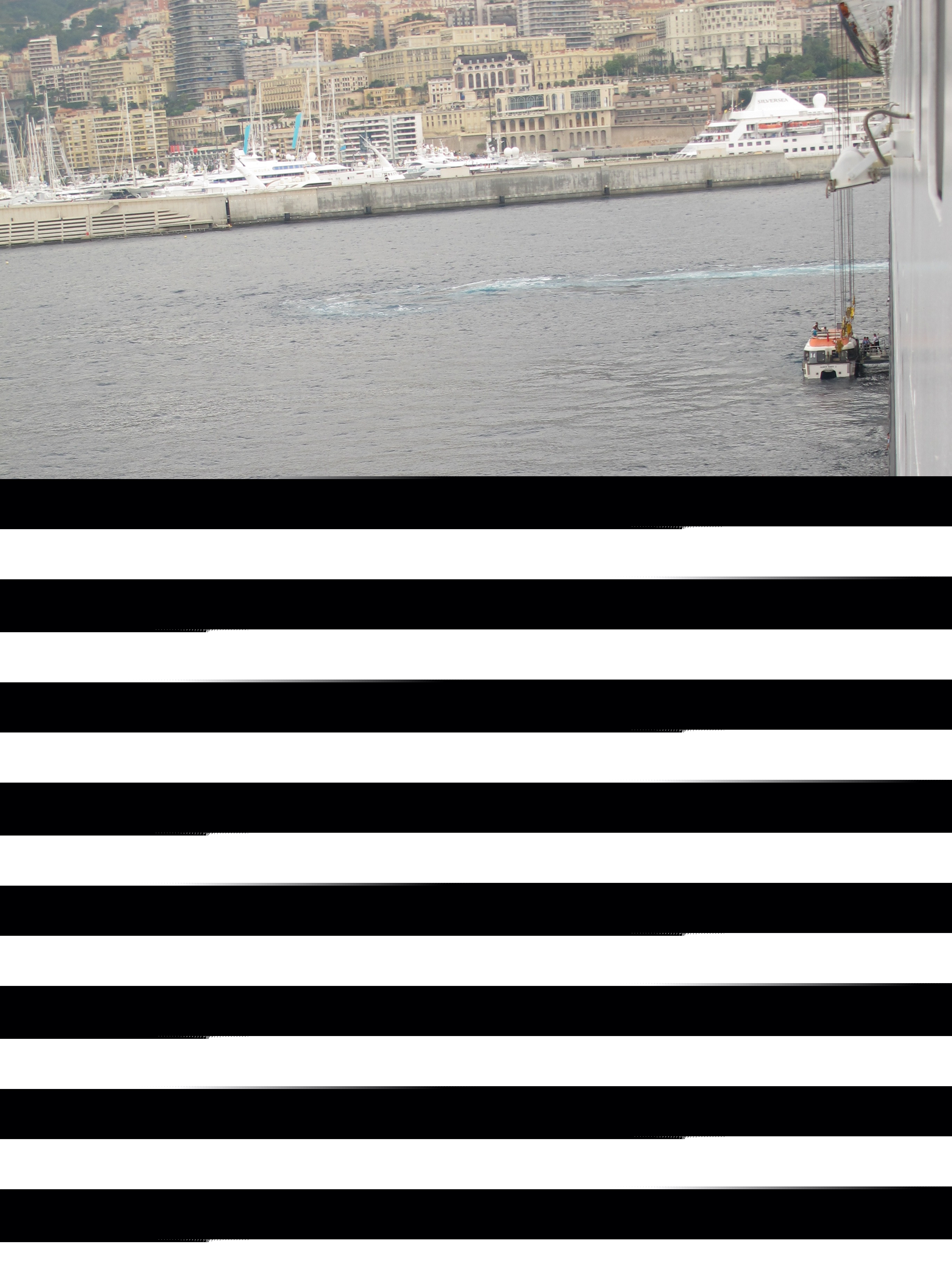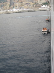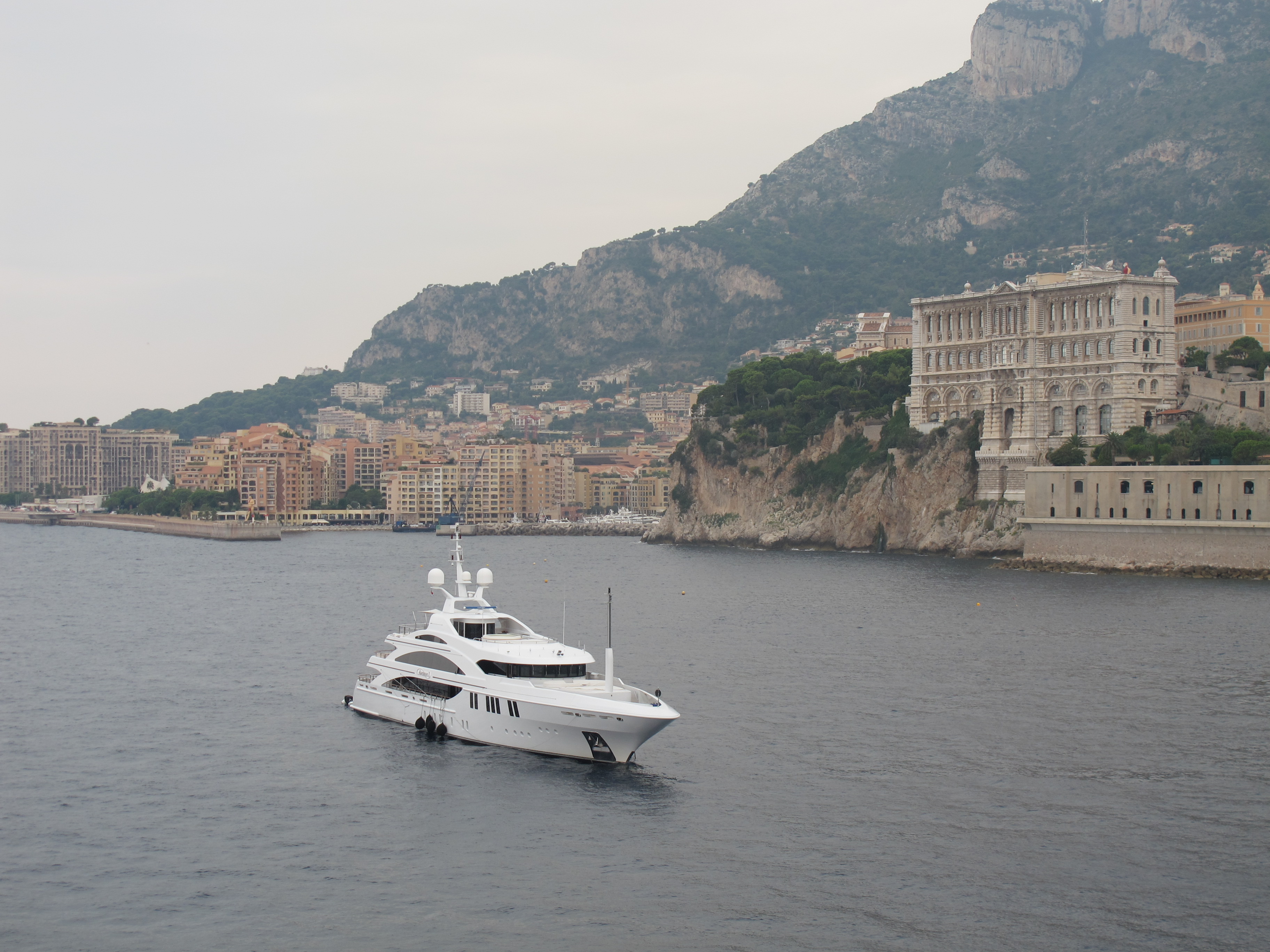 It isn't much more to get a "balcony" room on the QM2, and it has the charm that you arrive in the early morning hours so you have these amazing sights out your window when you wake up. My first view of Monaco: an absurdly expensive yacht against the tiny, crowded nation.