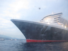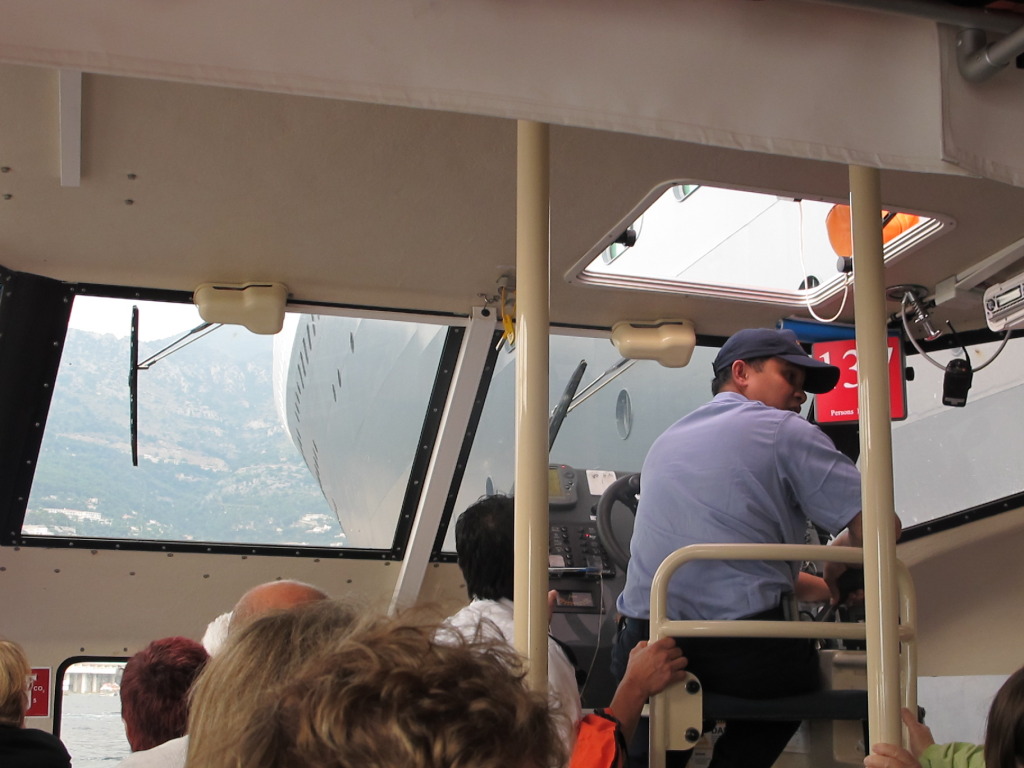 The view of the QM2 from the water right below, through the tender window, is very dramatic indeed. I realized how she must look to all the rich yacht owners. So, "Hey! Rich Boy! Check out MY ride!"