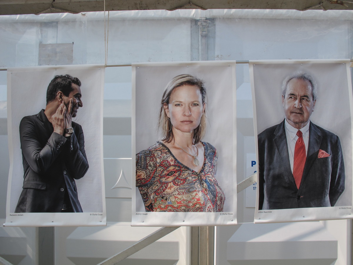 vThe "walls" of all the theatres are covered with posters for all the featured, lecturing authors at the fest, all done by one photographer months ago - Chris Cook.