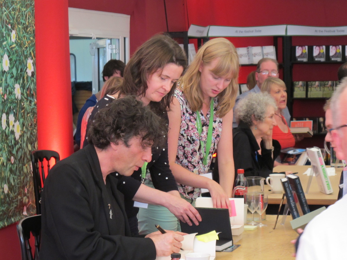 There were some almost bizarre juxtapositions - Neil Gaiman and Margaret Atwood, shown below, did not just happen to share the signing tent at the same time - they gave a joint lecture together; sold out, so I have no idea what things in their work had some commonality.