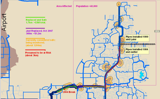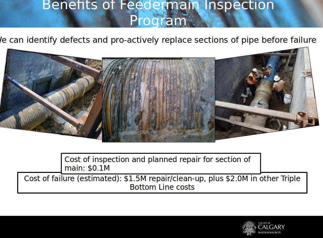 It was the very first time a large main had ever failed in Calgary; we'd started to regard them as simply bullet-proof. A colleague asked me in 2003 why we were inspecting small mains, but not large ones. I told him none had ever broken, so there was no budget. But that a single break would immediately hand us a million a year.