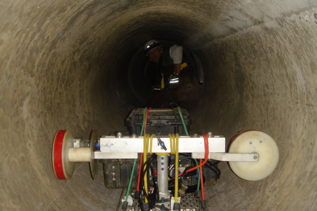 This 2009 slide shows the state of the art, for commercial, reliable work, at the time. The inspections not only required the main to be de-watered, meaning thousands of tonnes of water to be dechlorinated and wasted... they required four guys pushing it along, with eight bike wheels cradling it.