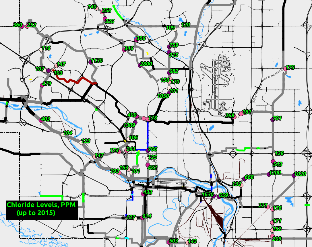 Scary is about the same number for any kind of corrosive ion: as you get past a thousand parts per million, get worried. There are some high numbers around town, here and there: 2800 north of Nose Hill park, 1200 and 1020 around 52nd St east...but nothing over 500 on those dozen tests done down by the river.