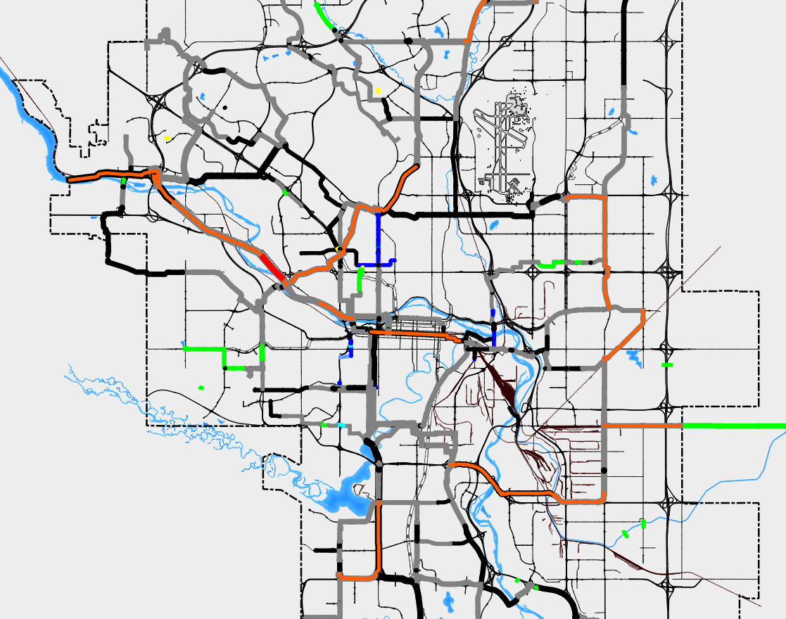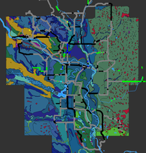 Looking again at the full city map, you see mostly cold soils on the west side of town. But, simplified down to silt and clay soils being warmer colours, there's one chunk of it - right on the Bearspaw South Feeder.